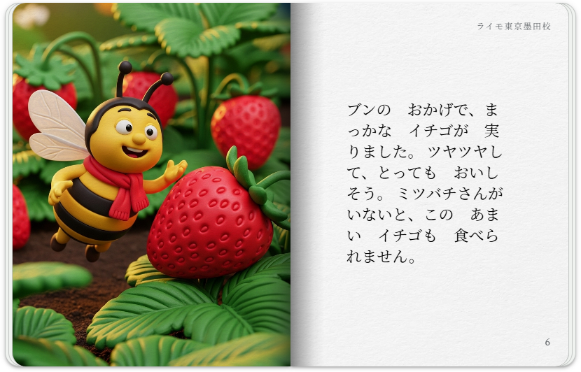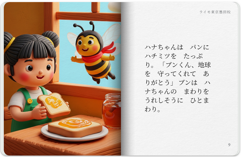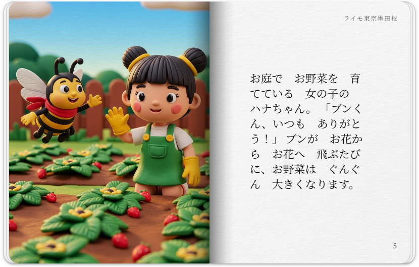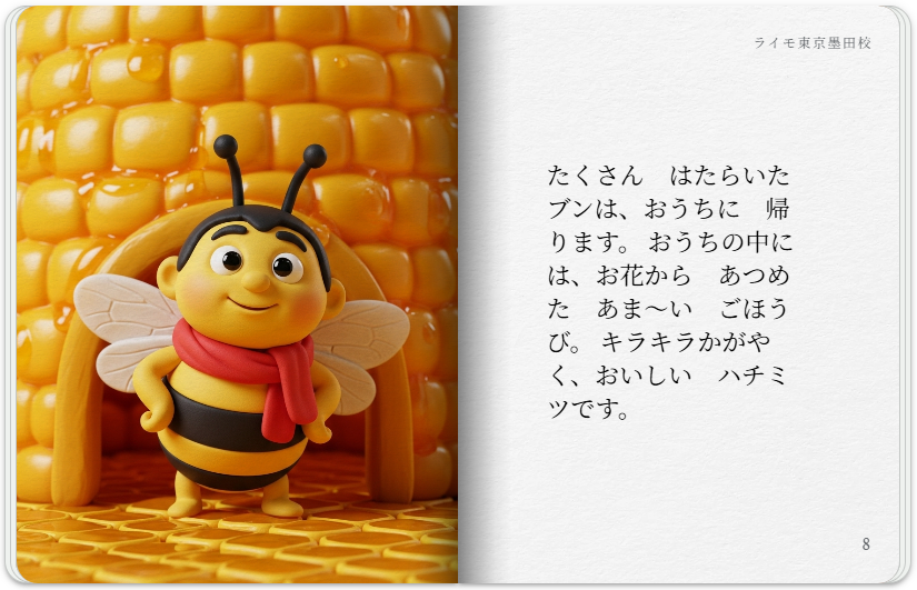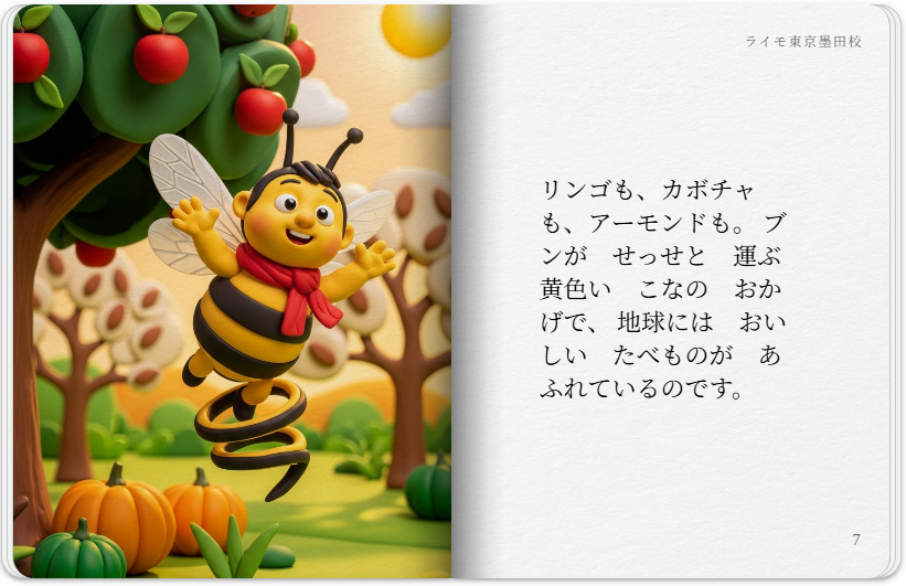 例題の文面:クレイアニメ風のアートスタイルで、親しみやすいミツバチをテーマに、ミツバチが地球にとってどれほど役立っているかについての storybook を作成し、子どもたちがミツバチを怖がらなくなるようにしてください。